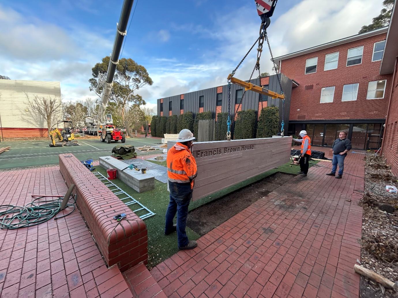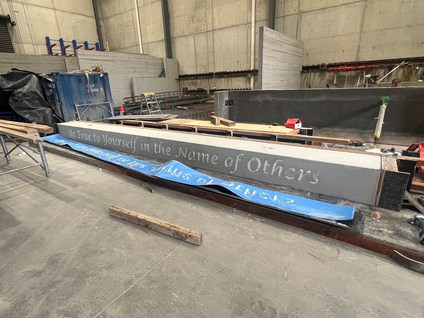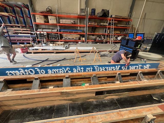 The embedded lettering introduced a second layer of complexity. We used polystyrene lettering placed precisely within the formwork before the concrete pour—a technique that requires meticulous attention to depth, alignment, and securement. The letters had to be positioned so they would be revealed at exactly the right depth after finishing, creating crisp, legible text that's integral to the concrete rather than applied afterward. Any movement during the pour, any inconsistency in concrete placement around the complex shapes, or any error in form release would have compromised the detail permanently.
