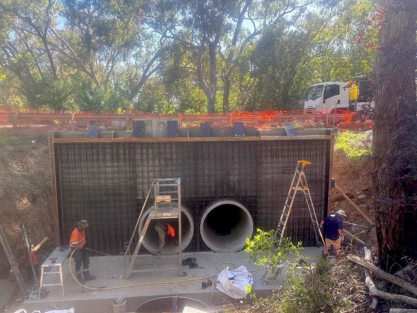 Most contractors would face an impossible coordination challenge in these conditions. They'd need to fabricate complex steel reinforcement cages in a space barely tall enough to stand in, or alternatively, they'd need to coordinate with a specialized reinforcement fabricator, arrange transport with a logistics provider, schedule a crane from an external hire company, and manage multiple subcontractors working in a confined space where one delay cascades through the entire schedule.